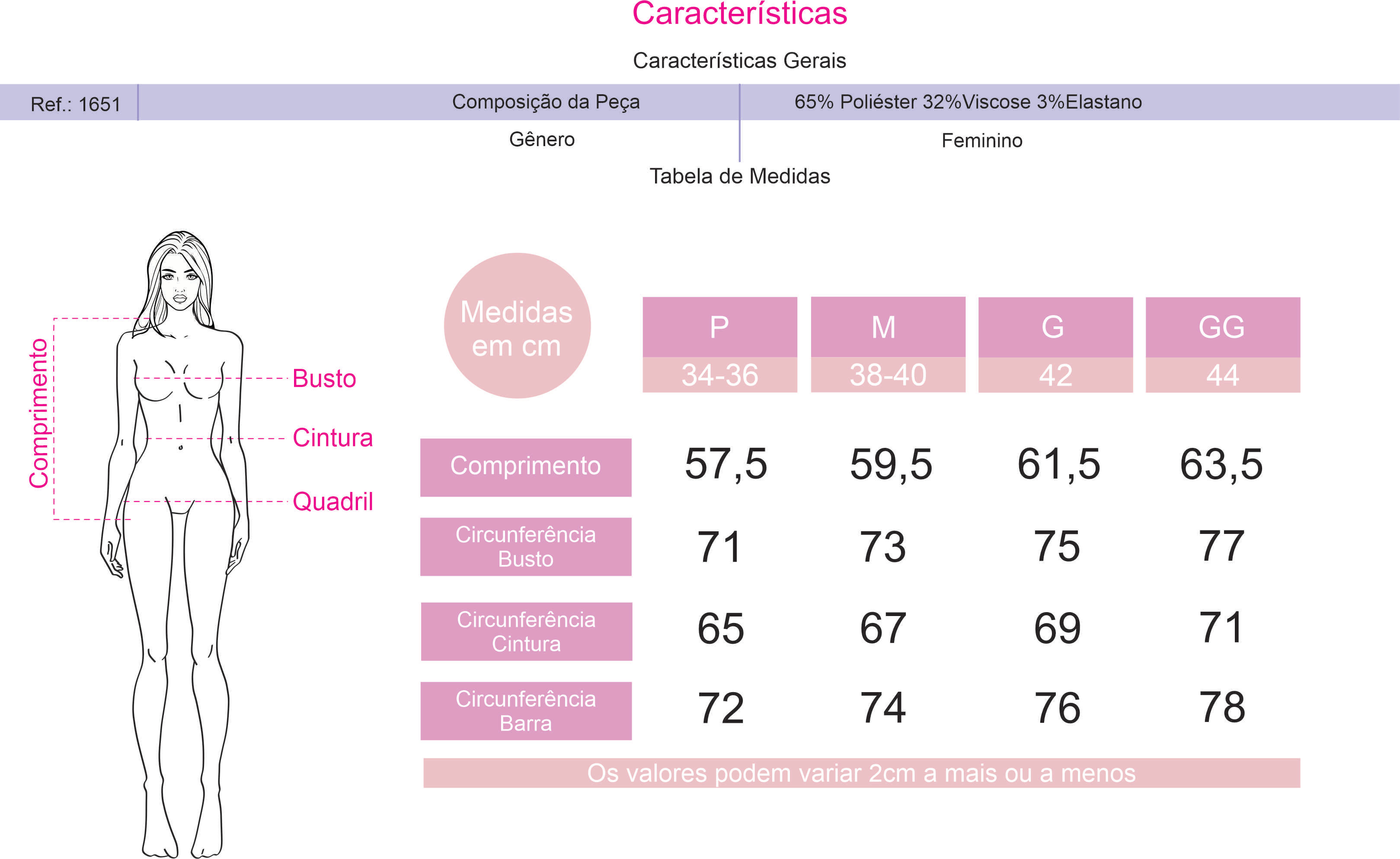 Ela é confeccionado na ribana canelada, com efeito 2x1. Conta com uma composição de 65% poliéster, 32% viscose e 3% de elastano. Com toque macio e envolvente.